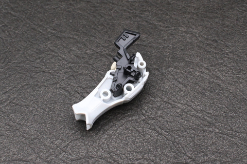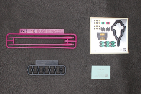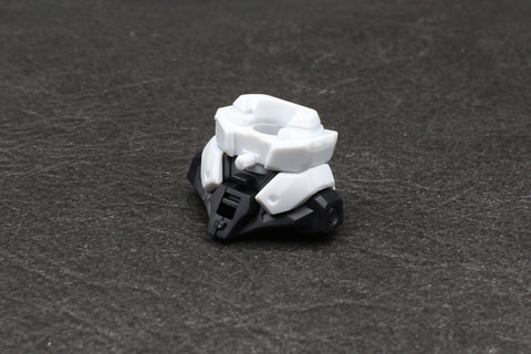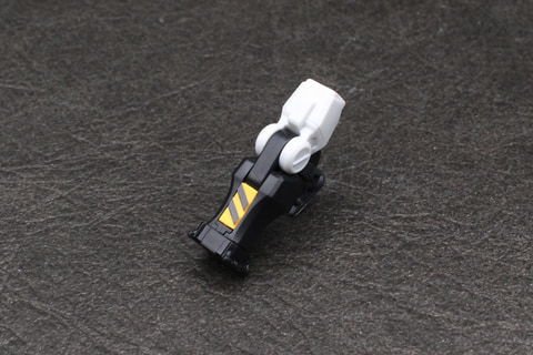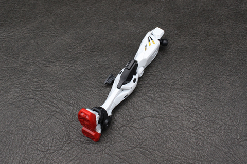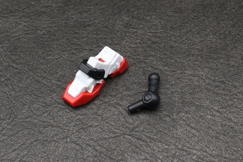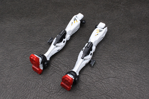 脚の付け根となる腰部はジョイントの受けがあるシンプルなもの。ガンダムシリーズの機体にある腰アーマーはデザイン上存在しない。脚部は白いガンダムや軽キャノンにも見られる太ももの独自の意匠をシールで表現している。かなり細いシールだが、凹モールドに貼るので動かしたときに剥がれてしまう恐れは少ない。腰のブロックは脚部の付け根に取り付ける設計で、ポジションは脚部の動きに依存する仕組みだ。MGシリーズのようなフレーム構造ではないが、脛の左右では、装甲で挟み込んだパーツの一部が露出してモールドになる設計が施されている。