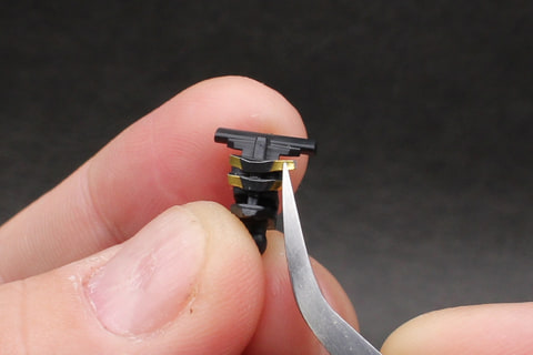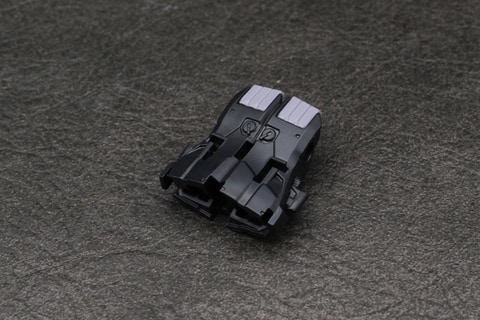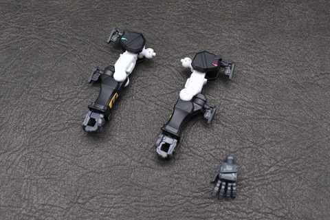 腕は細身の角張った形状で、肩と肘にハードポイントがある構造。左腕にシールドを装備するときは肘のハードポイントを交換して取り付ける設計だ。肩アーマーと前腕に貼るシールはかなり小さく剥がれやすいので、完成後に腕を動かすときは要注意。ワンポイントなので塗装してしまってもいいかもしれない。