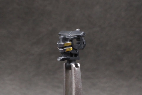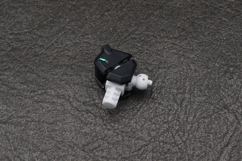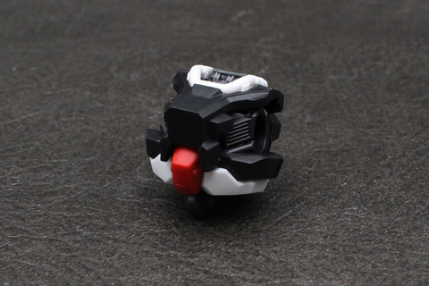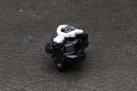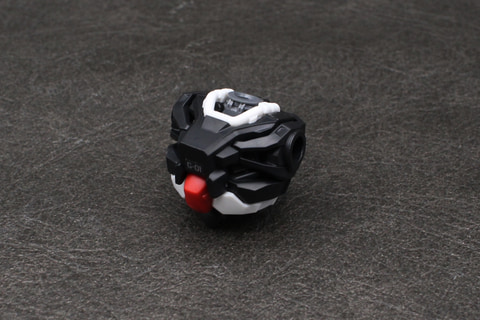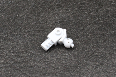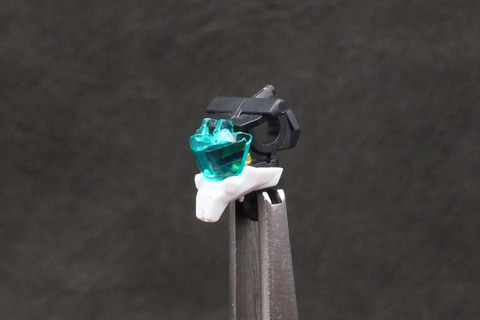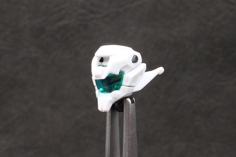 組み立ては頭部から開始。形状はガンキャノン系機体のそれと似ているが、V字アンテナと側頭部の飾りにわずかな違いがある。劇中でバイザーの中に見えた4つのカメラアイはホイルシールで再現していて、それがクリアパーツの中に見える構造。シールにはかなり小さいものがあるので貼るときはピンセットを用意しよう。