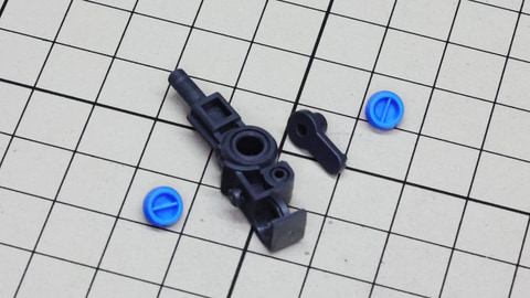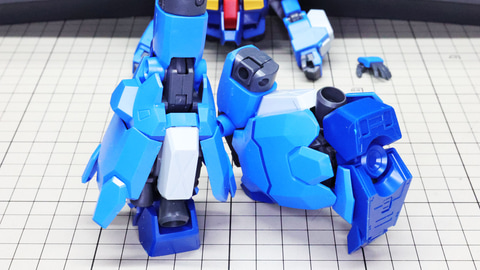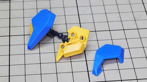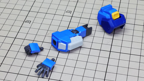 右腕を組んであります。肘関節の構造に注目のパーツ群です 肩アーマーに胴体部との接続ボールジョイントなどを組み込みます 先端のイエローのパーツが肩アーマーのゲート跡を隠してくれる、嬉しい設計です。 肘関節は二重構造です。同時にマルイチモールドのパーツも取り付けます 上腕と肩アーマーとの接続部はそれぞれ1パーツで設計されています ハンドは装備用でもある握りこぶしと平手が用意されます 胴体部の肩関節部の大きな可動性能もプラスされて想像以上に動く腕部! 脚部はこのキット最大のパーツ数を誇る部分となっています。ただ大きいだけでなく、各部ディテールやカラーを細かくパーツ分割しているうえ、脛下の装甲が開くギミックがあったり、膝関節にはシリンダーディテールを持ち、可動こそしないものの引き出しギミックでクラスを超えたディテールを魅せてくれます。ソールもつま先まで動くというすばらしい設計になっているので注目です。