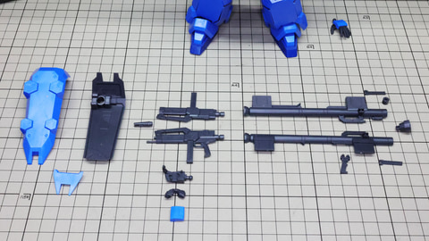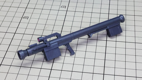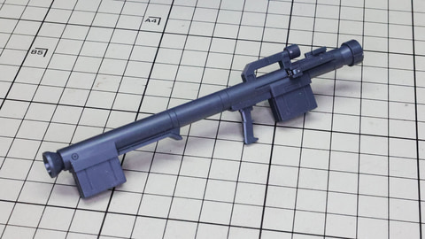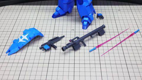 左からシールド、ビーム・ライフル、バズーカのパーツ群です シールドはパーツの合わさり方をよく見て押し込んでいきます バズーカも組み合わせてグリップ類を取り付けるだけです バズーカ、ビーム・ライフルはバックパック部に懸架できます