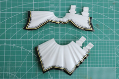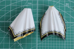 スカートシートはそれぞれ張り出している部分を、切り込み箇所に差し込んで円形に形成する。張り出し部分への差し込みの際はピンセットなどを使用して引っ張り込むと組みやすくなる。そして、腰回りに重ねて腹部で挟み込むような組み立てとなる。
