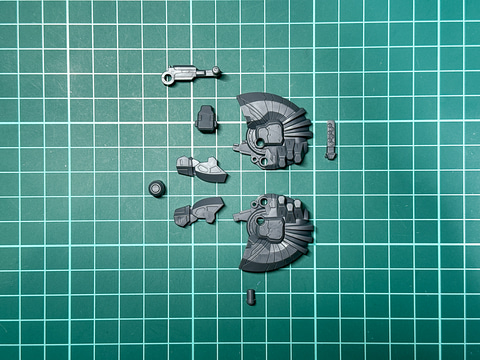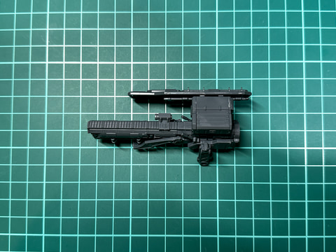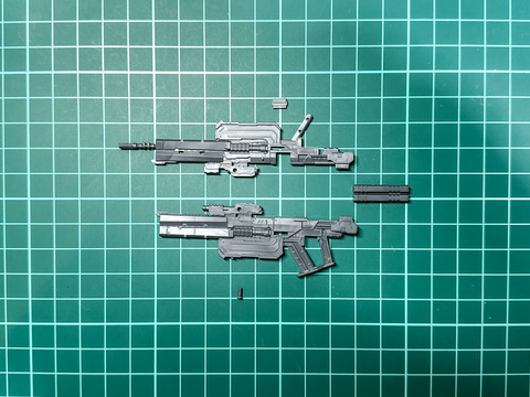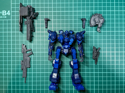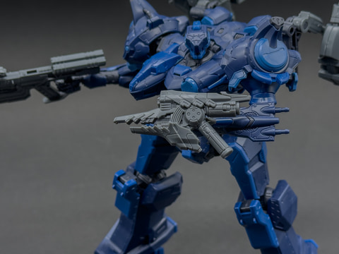 本機の右腕武装であるアサルトライフルは「30MM オプションパーツセット ARMORED CORE VI FIRES OF RUBICON WEAPON SET 05」に付属するアサルトライフルと同一形状です。そのため、本機では右腕武装として組み立てますが内部に挟み込むパーツとサイトに取り付けるパーツの向きを変更することで左腕用武装としても組み立てられます。