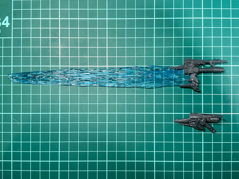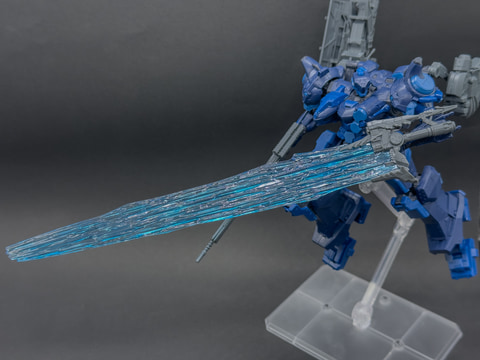 左腕武装のレーザーブレードはエネルギー系近接武装では最も攻撃力の高い武器です。キットではブレードの収納状態と展開状態を差し替えで再現します。レーザーブレードの刀身は他の近接武器と同様にクリアスカイブルーで成形されています。
