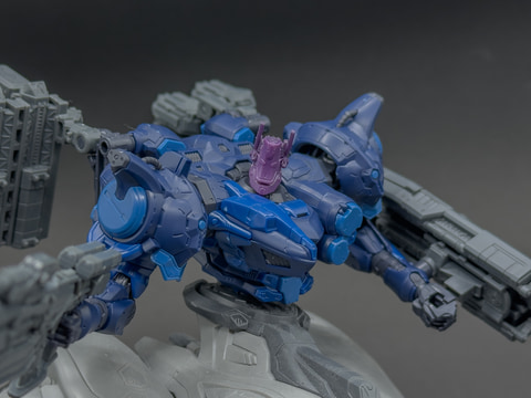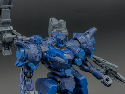 本機の頭部はベイラム製の角型デザインであり、アーキバス製のコアパーツとは異なる意匠ですが、配色により統一感を持たせています。