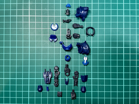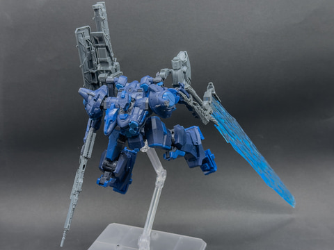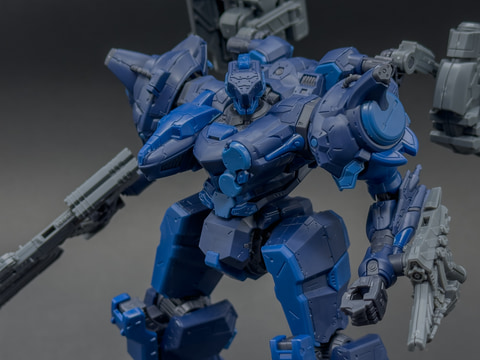 パーツ構成はコア、腕部、ブースタ、左腕武装が新規造形です。頭部および脚部パーツは発売中のキットから成形色が変更となり、その外装色はブルーとダークブルー、ライトブルーの3色です。なお、新規造形となる左腕武装には大型エフェクトパーツが付属し、ゲーム内のポージングを再現できます。