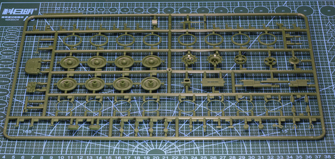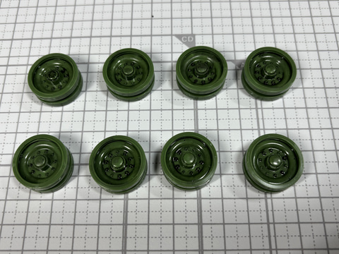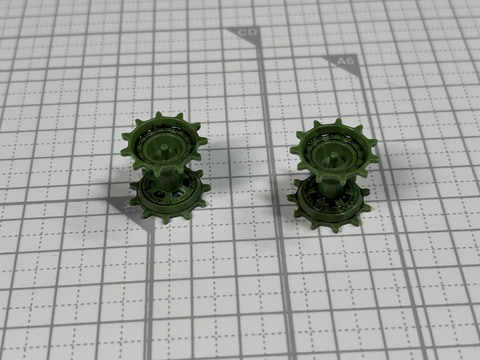 金属でできた履帯を動かす力強い起動輪、そしてスムーズに履帯を接地させる転輪は戦車プラモデルを組み立てる上でも楽しい場所と言える。特に転輪は本体に内枠、外枠を接着した上、軸部分のポリキャップがあり7パーツで構成されている。この転輪は左右合わせて8個。1つずつ組み立て、8つそろえるのはなかなか充実感がある。