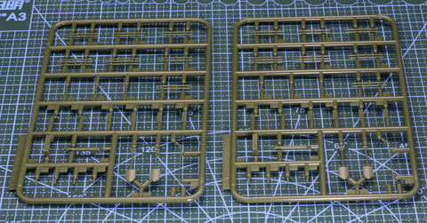 プラモデル「1/35 STRIDSVAGN 103C(S-タンクC型)」のランナーやパーツを見ていこう。本商品は緑と黒の成型色で色分けされている。黒は履帯パーツだ。パーツは250を超えるボリュームのある内容となっている。