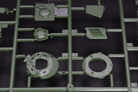 昨今のプラモデルでは「A-1とA-12を接着する」というようにランナー内でパーツを指定し、さらに「砲塔部分はAランナー」というように、部位でランナー分けがされている商品も多い。それに対し、「1/35 STRIDSVAGN 103C(S-タンクC型)」は、1~198までパーツ番号が割り振られている上、「82に3をくっつけ、その側面に155」といった感じで、複数のランナーとその対応番号が指定されているため、何度もパーツ表を見て確認する必要があった。筆者にはちょっとパーツを探すのが難しかった。