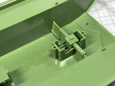 次に組み立てるのはコマンダーハッチ側面に取り付けるKSP58機銃。この機銃はベルギーが開発した汎用機関銃FN MAGをスウェーデンで国産化したもので、S-タンク以外にもスウェーデン軍の車両や船舶にも使われている。