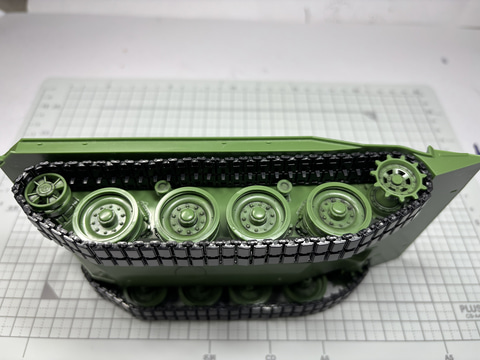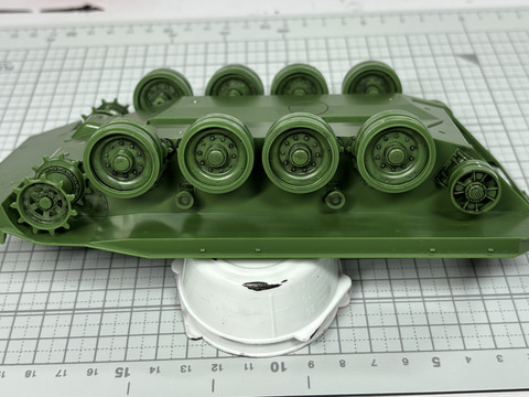 次は車体だ。本キットの大きな特徴である。「姿勢制御」を再現するため、前から2番目と4番目の転輪の軸そのものが回転するクランク状の軸を取り付ける。その上で転輪を取り付けていく。上部支持輪は接着してしまうが、起動輪、転輪、誘導輪は軸にポリキャップが使われており回転する。