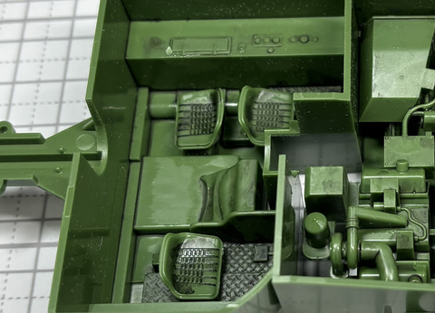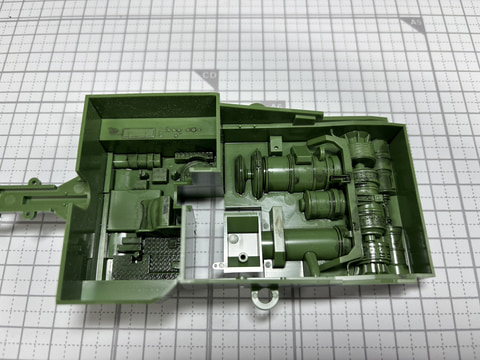 エンジンに加え操縦席も組んでいく。S-タンクC型は3名の乗員で運用する。車長と操縦士が前方を向き、後ろ向きに無線手が座る。そして中央には巨大な砲の基部が貫通する。S-タンクC型は前方にエンジンがある構造になっているが、これは前方から攻撃されたとき大きなエンジンが壁となって人員を守ることを考えているという。