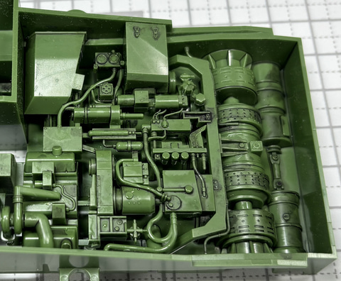 ここからエンジンを組み立てる。エンジンはパーツに造形されており、複雑な構造を数パーツ組み合わせるだけで表現している。S-タンクC型はディーゼルエンジンとガスタービンエンジンを1基ずつ持っているのが大きな特徴で、そのエンジンの形をしっかり表現しているところが楽しい。複雑な構造はスミ入れだけでも充分見応えがある。さらにこのエンジンは組み立て後も見ることができる本商品の大きなセールスポイントなのだ。