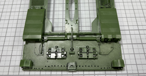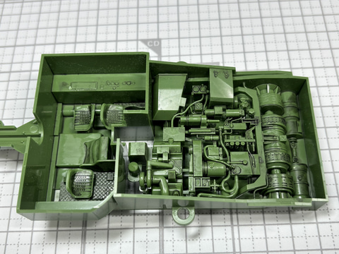次は車体上部の装備を組み立てていく。向かって右側には2門の機関銃が内蔵されているボックスがあり、ハッチを開けることができる。ハッチの裏には様々な道具が装備されているのも表現されている。