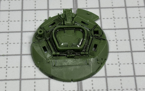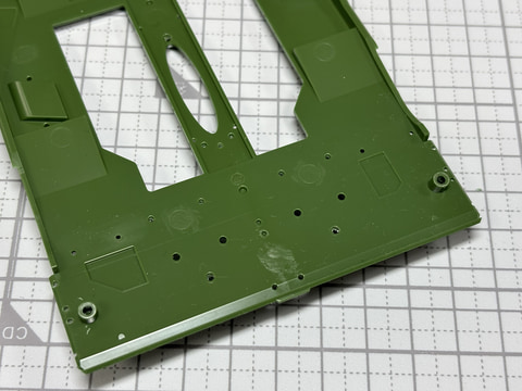 ここからは車体上部を組み立てていく。車体上部となる基部パーツにまずピンパイスで穴を開けていく。この開けた穴は後で様々な部品を取り付けることとなる。特に前方に設置する「柵アーマー」を取り付けるには前の部分に左右合計で32個の穴を開けていく。