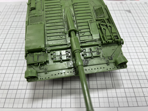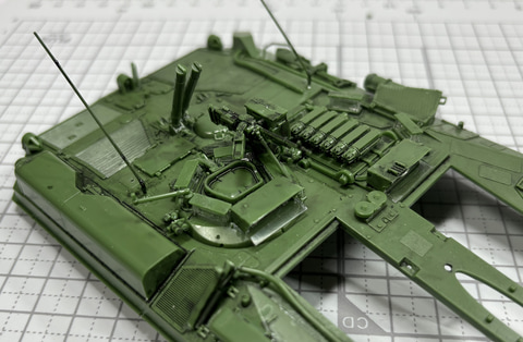 次は車体後部の装備。ドライバーズハッチ用のペリスコープや、ディーゼルエンジンの排気口、後部のライトなど細かい部品を取り付ける。これらを取り付けてから、ドライバーズハッチ、コマンダーハッチを取り付ける。上部の部品を取り付けたところで車体下部と接着。ここまで来るとかなり戦車としての形がしっかりしてくる。
