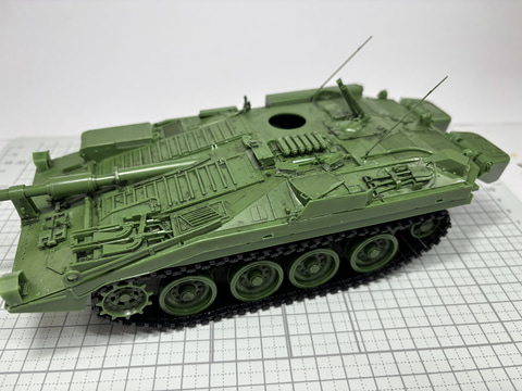 いよいよ完成へと向かう。主砲、そしてエンジンハッチを取り付けていく。S-タンクC型の主役と言える主砲はイギリスで開発された105mm戦車砲をベースに、62口径に長砲身化したもので自動装填、自動排莢機能が搭載されており、毎分15発という連射速度を誇る。砲塔がなく長大な砲が車体を貫通している構造を、プラモデルを作ることで実感できる。