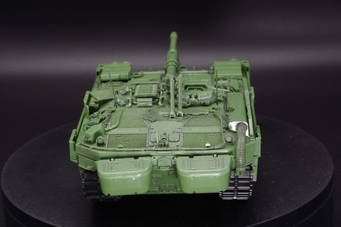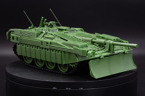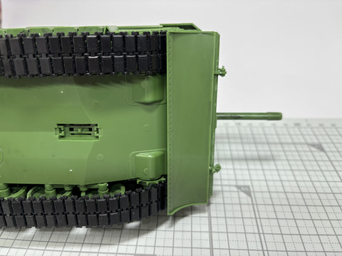 最後に取り付けるのがドーザーブレード。これは展開することで土砂を押し出し陣地構築を可能とする。ドーザーブレードをオプションとして取り付けるという戦車もあるが、S-タンクC型は標準装備でこのドーザーブレードを装備している。防衛用の役割を担っての設計が感じられるし、厚いドーザーブレードが追加装甲としての機能も持っているのだ。