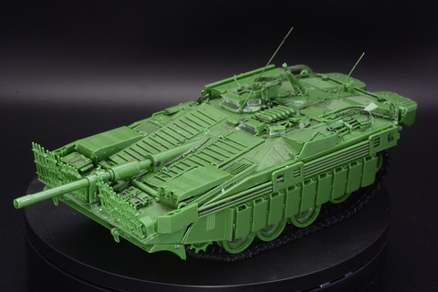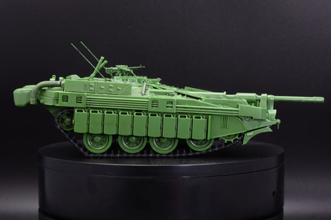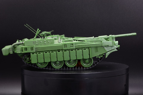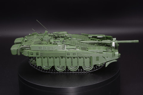 S-タンクA型は1965年に制式化。今回モデルアップされたC型はB型の渡河を可能とする浮航スクリーンや、ドーザーブレード、ガスタービンエンジン搭載などを受け継ぎつつ、ディーゼルエンジンとガスタービンエンジンを1基ずつ搭載、照明弾発射機、FCS(火器管制)更新、予備燃料タンク兼対HEAT弾用サイドスカートなど多数の改良が行われ無砲塔戦車の完成形ともいえる存在となり、A型、B型はすべてC型に改修される。