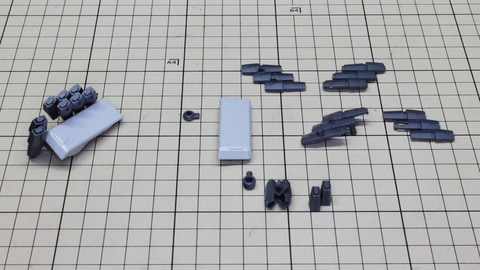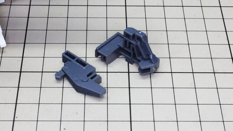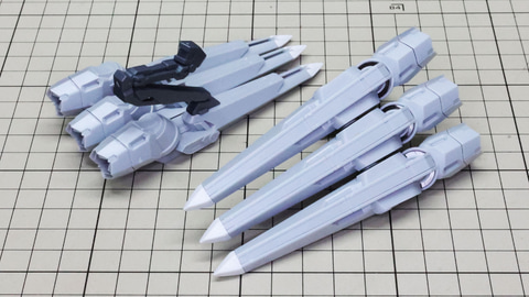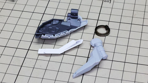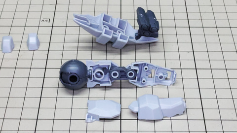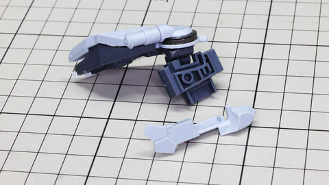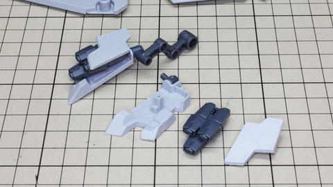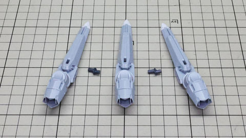 3基分のシェルフ・ノズル本体に注目。中央用は左右接続用に両方の軸穴が用意されています 構造自体は特に難しくはありません。これまで組んできた推進機と同じです 腕部を組んでいきます。アリュゼウスは量産型νガンダムの脚部には増加装甲が取り付けられましたが、腕部は別途用意されています。便宜上腕部と呼びますが何かを握れるハンドがあるわけではなく、先端にはミサイルを装備しています。肘にあたる部分はモビルスーツっぽい二重関節となっていて様々な考察も楽しめる部分でもあります。