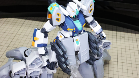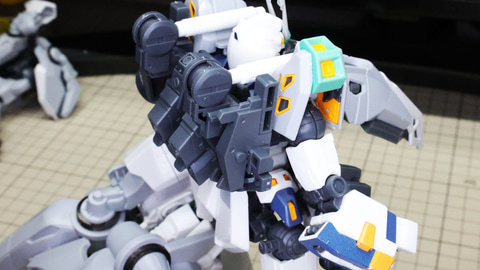 ボディを構成していきます。腰部や胸部に増加装甲・装備を取り付けていきます。腰部はHWS(ヘビー・ウェポン・システム)の装甲ユニットを思わせるデザインでそれを知っているとにんまりしてしまう部分ですね。そこにもミサイル群が取り付けられています。