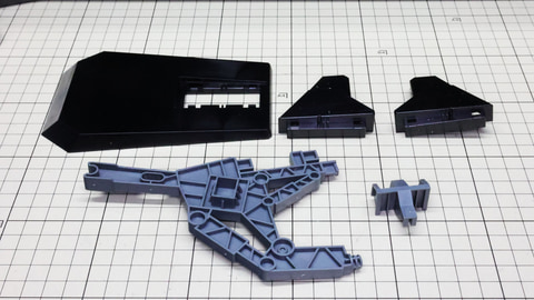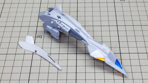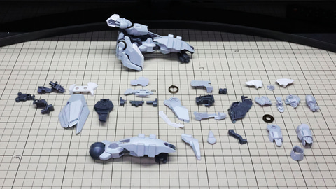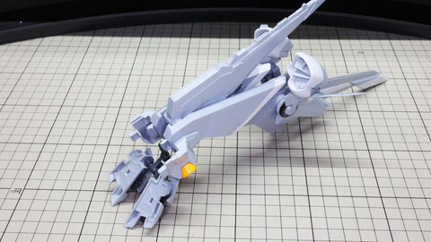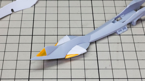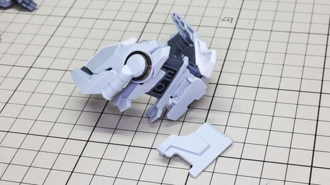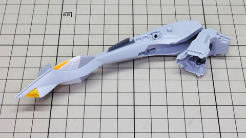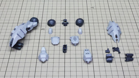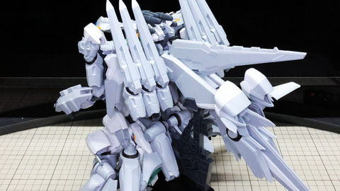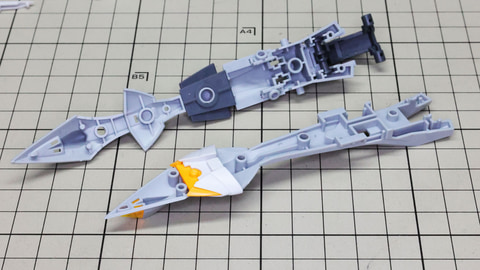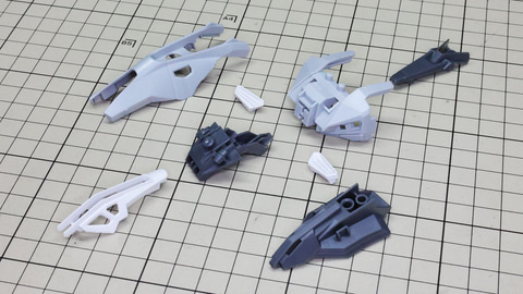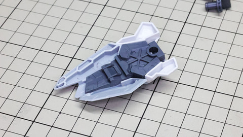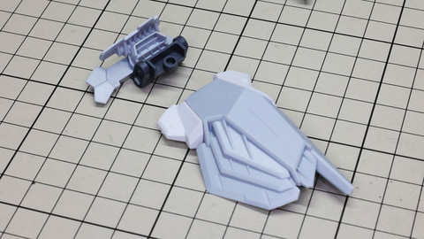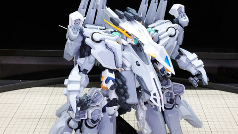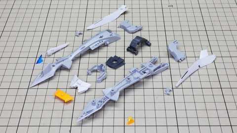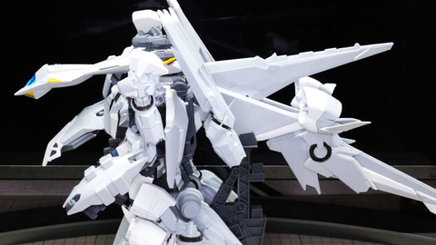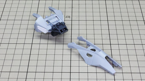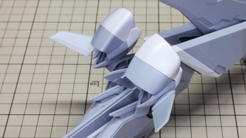 装甲ユニット裏側にはフロントアーマーへの接続軸も持ちます 胸部増加装甲を組んでいきます。カラーでパーツ分けされていて絶妙なアールの表面で設計されています 胸部全体を覆う装甲に、先端を構成するパーツを取り付けます テール・スタビライザー(便宜的にそう記述しました)を組んでいきます。ペーネロペーにもあるこの部分はアリュゼウスならではの推進機を持っているのが特徴です。このキットの中でも最大の部位になりますが、パーツ自体も大きく設計されているので組みやすさは損なわれていない印象です。グレーとホワイトのパーツはそれぞれ色分けされており、シャープなコントラストを描きます。