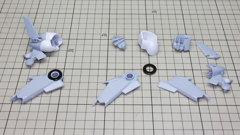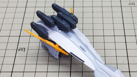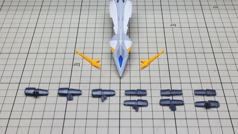 ペーネロペーとの関係性を感じさせる機首部分のパーツ群 これは機首下部のディテールです。イエローのクリアーパーツが使われます 大きなアンテナと上面に取り付けられるミサイル群を組んでいきます 底面には量産型νガンダムのアンテナを逃がす部分が用意されています 背部シェルフ・ノズルを組んでいきます。劇中の量産型νガンダム登場時の印象的な姿に驚いた装備です。片側3基で全6基が用意されています。フィン・ファンネルと同様にお互いで接続することになりますが、これは接続パーツが用意されます。形状はすべて同じですが、この接続のために左右、中央でパーツが違うのでよく見て組みたいところです。