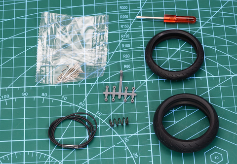 それでは「1/12 Honda CB1000F」のパーツ構成を見ていこう。ランナーはA、B、C、D、Gの大きなランナーに加え、メッキのEランナーや、クリアパーツ、そしてネジやバネ、ケーブル、ゴム製のタイヤなどで構成されている。スライドマークは実車に設定されている3つのカラーパターンと、各種マーキングを再現できる2枚が封入されている。