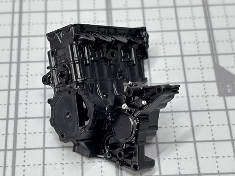 黒のエンジンに銀のビスが映えるエンジンの組み立て