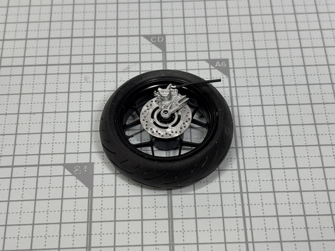 前輪を組み立てていこう。CB1000Fの前輪は両側にディスクブレーキが取り付けられている。フロントタイヤを支えるフロントフォークにもメッキパーツが使用され、アクセントになる。