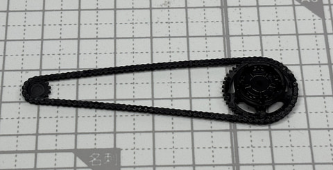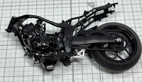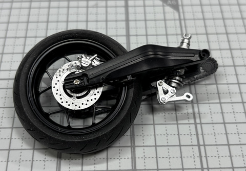 次は後輪だ。ディスクブレーキ、エンジンからの動力を後輪に伝えるためのギアとチェーン、後輪をスイングアームに取り付けた後、リヤダンパーを接続したスイングアームを本体に取り付ける。フレームに後輪がつくことでかなりバイクとしてのシルエットがはっきりしてくる。