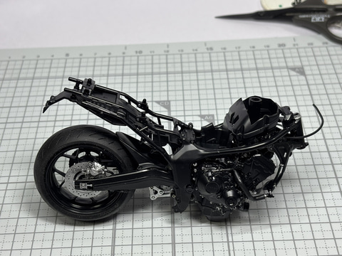 組み立てたエンジンをフレームに設置する。大きなエンジンをフレームに入れ込む作業は実際の大きなバイクを組み立てている感覚が味わえる部分。タミヤのバイクのプラモデルはエンジンの位置を固定するために金属のネジを使うところが「実車感覚」が増す。大型のエンジンがしっかりとフレームに接続されるという”演出”が楽しい。
