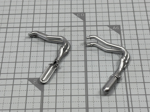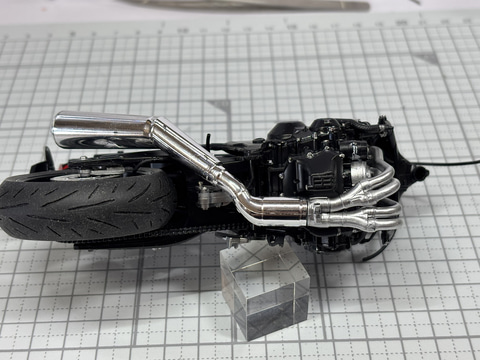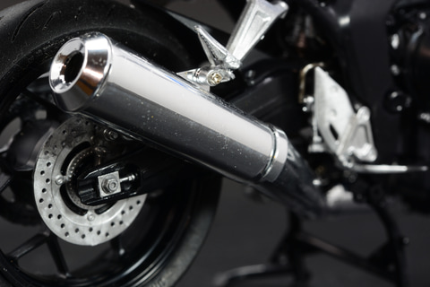 エアボックスの次がマフラーだ。4気筒のエンジンからの排気が1つにまとまり大型のマフラーに繋がっていく。この太い金属管が描く曲線の面白さは、大型バイクで特に面白い部分だろう。こちらもスプレーで銀色を強めた金属管に、鏡のように磨き上げられたマフラーがつながる。マフラーのメッキパーツはとても見応えがあるので注目ポイントだ。