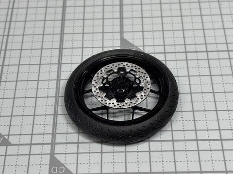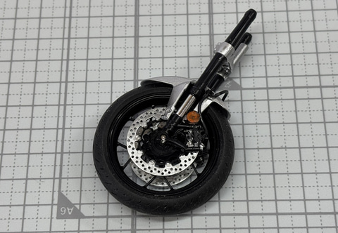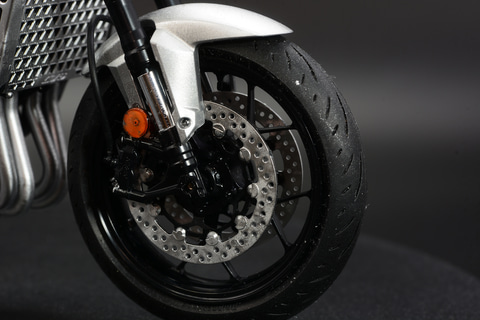 前輪にはクリアパーツによる反射板がついているのも注目ポイント。黒と銀で構成されたCB1000Fにピンポイントで明るい色が入るのが面白い。前輪を取り付けることで、しっかりとしたバイクのシルエットができあがる。