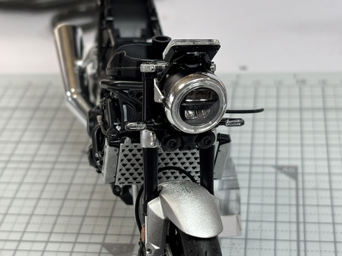加えて「ヘッドライトカウル」がある。これは実車に設定されているオプションパーツで、つけることで雰囲気が変わる。このヘッドライトカウルやラジエターグリルなどのオプションを装着した「CB1000F SE」として組み立てることもできる。ヘッドライトカウルの取り付けは接着剤を使わないので、完成後も着脱可能だ。