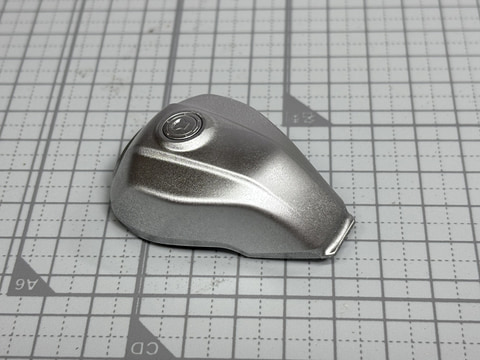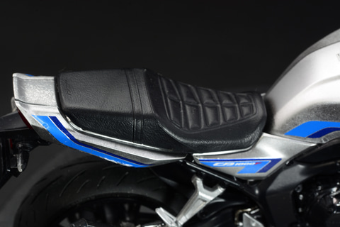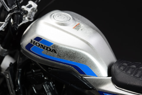 青いラインは塗装で表現するにはかなり難しいだろう。「1/12 Honda CB1000F」ではスライドマークを貼るだけで手軽にこの印象的な青いラインを引くことが可能だ。銀の無地だった時と比べ、実車のイメージに近づく。繰り返すが銀の部分をスプレーで塗装するだけで、このスライドマークもより際立つ。