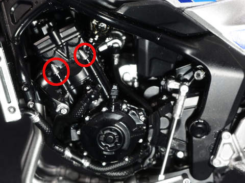 「1/12 Honda CB1000F」を組み立てる上で、銀のボルトはぜひ表現しておきたいところだ。細い筆でボルトのモールドを塗っていくだけで、実車のエンジンの雰囲気が手軽に表現できるのでオススメだ。