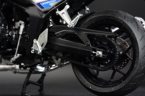 もう1つの注目ポイントが「ケーブル」だ。ここでは後輪のキャリパーとブレーキペダルを繋ぐケーブルもきちんと表現される。フルカウルのバイクだとこうした配線も隠れてしまうが、CB1000Fの様なネイキッドバイクではこれも1つの見せ場なのだ。