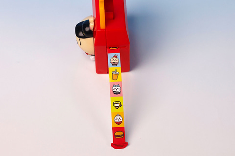 こちらの「うさぎのシールディスペンサー」は、うさぎが付けられたハッピーセットボックス型のシールディスペンサーだ。側面を引っぱるとシールが伸びる仕組みになっており、必要な分だけ使うことができる。あらかじめ入っているシールはあまり長くないため、すべて使い切った後は別のものと交換して入れておこう。上部にレバーが付けられており、こちらを指で動かすことでウサギの体の向きも変わるようになっている。