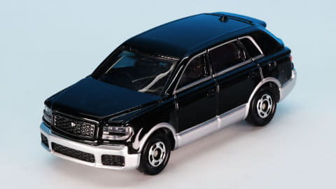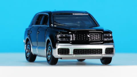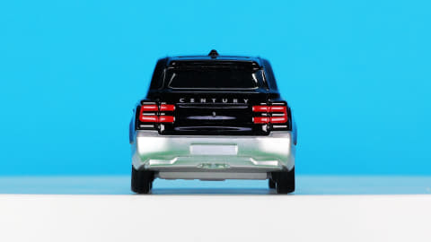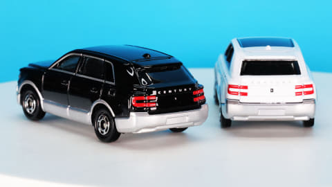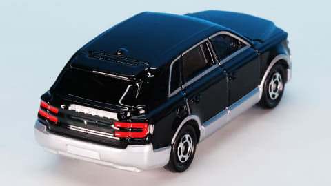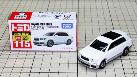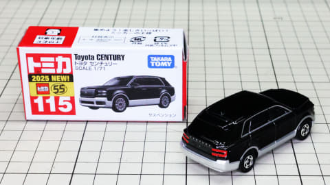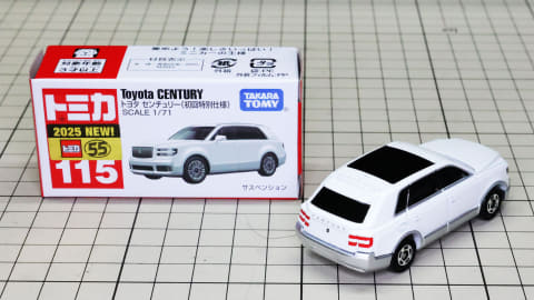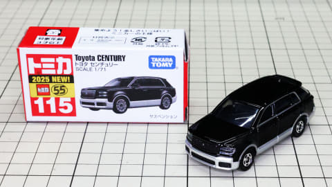 それではトミカになった「No.115 トヨタ センチュリー」を見ていきましょう。モデルとなったのは2023年に登場したSUVタイプ(GRG75型)で、現在“センチュリー”という名称はこのボディタイプの事を指し、2018年登場のセダンタイプ(UWG60型)は“センチュリー(セダンタイプ)”という名称になります。センチュリーとしてはどちらも3代目にあたります。