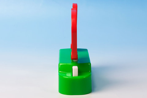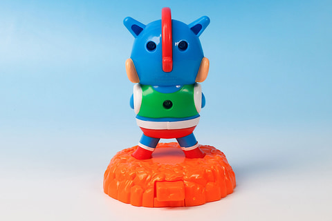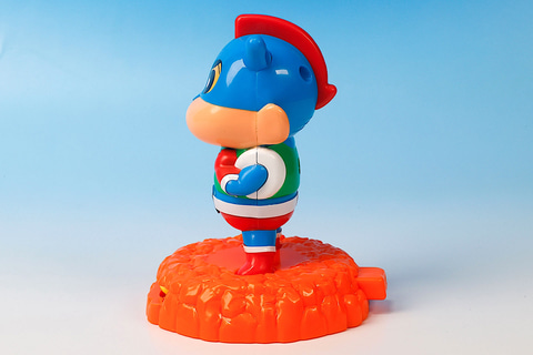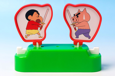 昔からよくある、アナログの対戦ゲームを集約したような遊びが楽しめるのが、こちらの「ぶりぶりざえもんとチャンバラゲーム」だ。遊び方としては単純で、付属の台座部分にしんちゃんとぶりぶりざえもんの絵が描かれたパネルをセットし、ボタンを押して相手のパネルを飛ばしたほうが勝ちというもの。