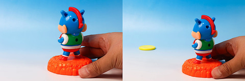 もちろん飾るだけではなく、おもちゃとしても楽しめるギミックが用意されている。このアクション画面の台座部分は付属のディスクが取り付けられるようになっている。こちらを設置して後ろ側にあるボタンを押すことで、前面に飛び出していくようになっているのだ。