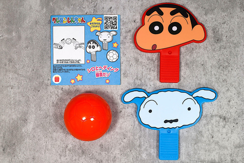 こちらの「シロとヘディング勝負だゾ」は、しんちゃんとシロの顔がラケットにプリントされたおもちゃだ。遊び方としてはシンプルで、こちらのふたつのラケットと付属のボールを使って打ち合うというもの。テーブルのようなちょっとしたスペースでボールを打ち合って遊んでみよう!