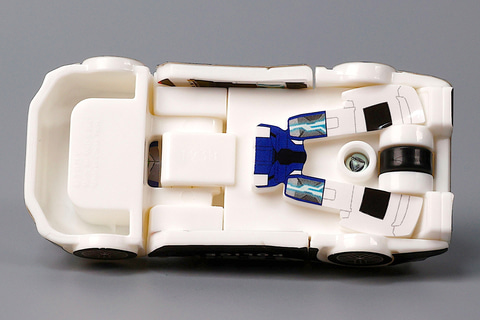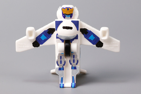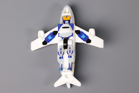 この旅客機の状態から変形させることで、スカイブレイバーにすることができる。車両と異なり若干バランスを取るのが難しいため、自立させて飾るときは尾翼の部分の角度をうまく調整するようにしよう。また、こちらのおもちゃも旅客機の状態で走らせて遊べるように、底面側に車輪が付けられている。