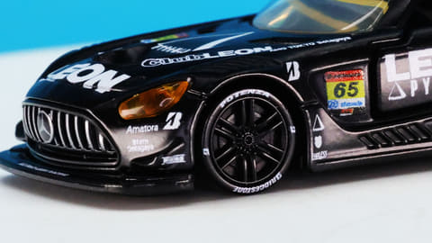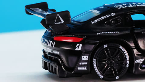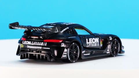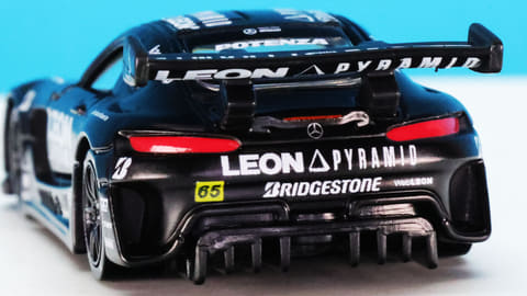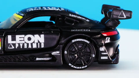 それでは今回の「トミカプレミアムRacing レオン ピラミッド AMG」を見ていきましょう。モデルとなったのはもちろんメルセデス AMG GT3!「グッドスマイル 初音ミク AMG 2024Ver.」と同一のスーパーGT・GT300クラスのレギュレーションに合わせたボディーシェイプとなっています。