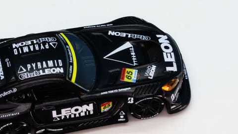レオン ピラミッド AMGは雑誌LEONのイメージを反映し、マットブラックベースのボディーカラーにほぼすべてのロゴ類がホワイトカラーで描きこまれていてLEON RACINGが持つ精悍なイメージを具現化しています。主要スポンサーである「ピラミッド」は繊維事業を行っている会社で、タイヤなどゴム製品の機能性を向上させる繊維補強材などを開発しています。