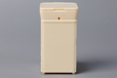 今回の「1/10 SUZUMO 寿司ロボット(シャリ玉)」でも、そのすべてではないものの、ある程度オリジナルのマシンにあった要素が再現されている。たとえば、本体上部の蓋は取り外しが可能だ。中を開けてみると、白い酢飯がギッシリと詰め込まれた様子が見られる。この蓋の裏側には突起が付けられているが、こちらは水蒸気の水滴を戻すために設けられた構造で、実物にもある。