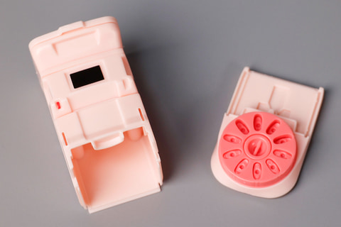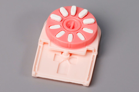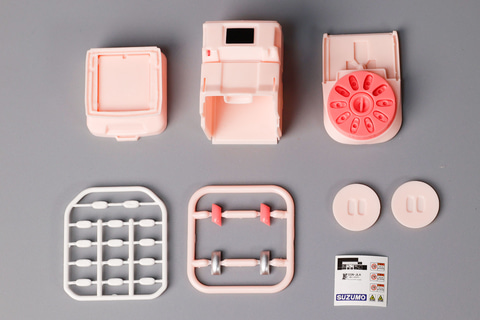 カプセルから出てきたのは、コンパクトにまとめられたパーツ類とマニュアル、そしてデコレーション用のシールだ。実際に組み立てるとカプセルには収まりきらないサイズになるため、よく考えられてパーツが詰め込まれていた。今回はパステルピンクをピックアップしてご紹介しているが、本体はカラーリングが異なるのみで構造は同じだ。付属する寿司のネタはカラーによって異なる。