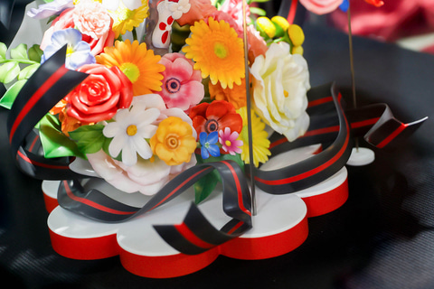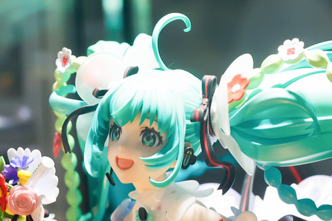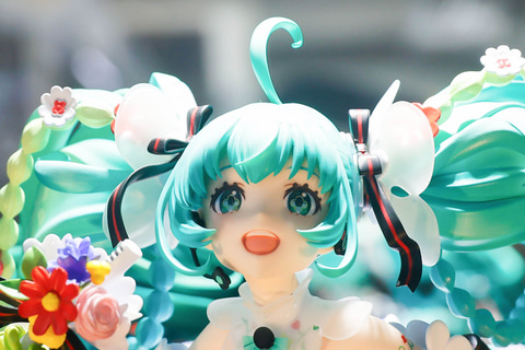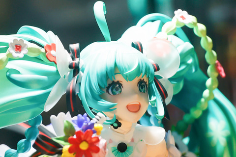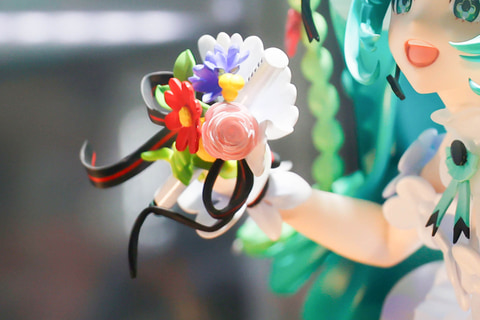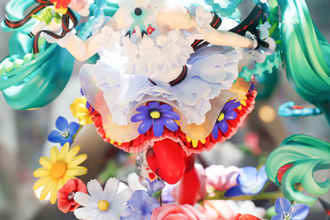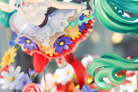 スカート部分はもちろんのこと、台座部分も含めて、多彩な花が表現されている点もこの作品の特徴だ。また、台座に表現された花束の上に浮かんでいるような見た目になっているところも素晴らしい。ミクの緑色の長い髪と、赤いタイツの色合いも美しく見える。