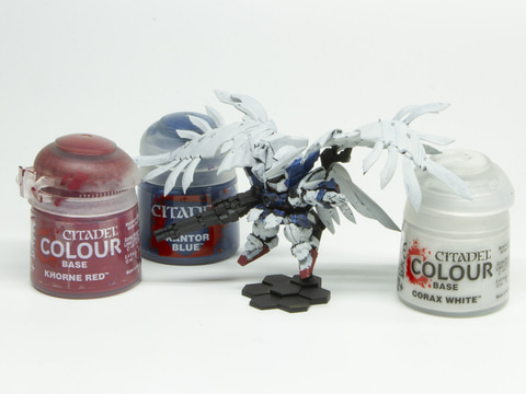本製品のようなミニチュアを塗装する場合、大きな面や段差の内で最も低い場所から、大きな筆を使って塗っていく。「ウイングガンダムゼロ EW」でいえば青が最も大きい面といえる。濃く暗い色から鮮やかな色に塗っていくため、今回はまず「カントール・ブルー」、「コラックス・ホワイト」、「コーン・レッド」から塗る。